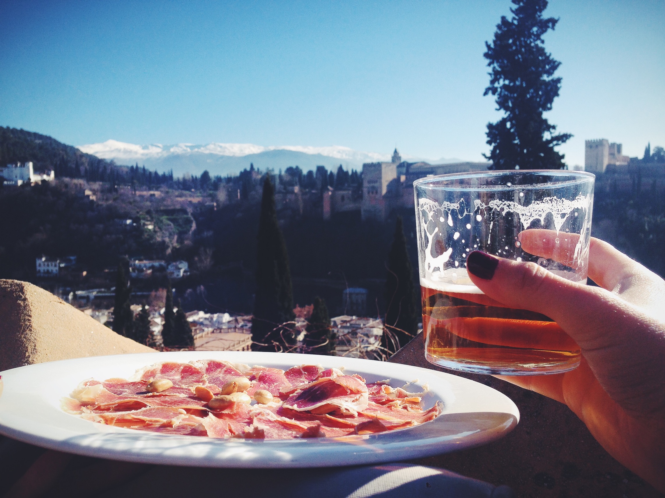 Ich hatte auch das Glück einen Tag lang nach Granada fahren zu können, das ungefähr 125 Kilometer entfernt liegt. Für die Besichtigung der Alhambra hat es leider nicht mehr gereicht, da man frühzeitig Tickets benötigt und ohne Vorverkauf eigentlich erst gar nicht dahin fahren muss. Trotzdem lohnt sich ein längere Spaziergang auf die andere Seite des Berges. Hier befindet sich das El Huerto De Juan Ranas Restaurant, von dem ihr einen wahnsinnigen Blick auf die Alhambra und wenn das Wetter sehr gut ist sogar auf die Sierra Nevada.