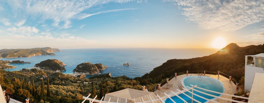 Die kleinen Wohnungen sind mehr als stylisch ausgestattet, teilweise mit einem privaten Außenwhirlpool und teilweise mit einen wunderschönen Ausblick auf Korfus Sonnenuntergang: